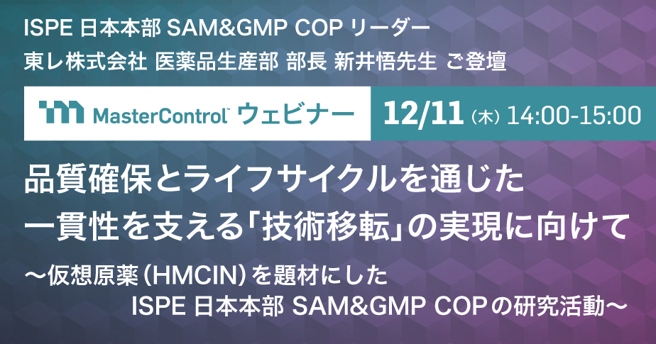 ISPE(International Society for Pharmaceutical Engineering, Inc.)は、世界各国の医薬品開発・製造に従事する22,000人を超える会員が120以上の国から参加し、最先端技術、各国制度、業界トレンド等について交流する場として年々発展しており、日本においても、2002年の日本本部発足以来、グローバルなコミュニティを基盤にして、国内外の人脈の交流を積極的に推進しています。また、SAM&GMP (Scientific Approach to Manufacturing & Good Manufacturing Practice) COPは、科学的製造アプローチとGMPに関する研究及び研鑽を目的に活動しており、現在はISPE Good Practice Guide :Technology Transfer Third Editionの翻訳、並びにモデル会社とモデル原薬(仮想原薬HMCIN)を用いた技術移転の事例研究などに取り組んでいます。